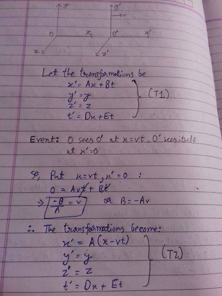 The lorentz transformation equation transforms one spacetime coordinate frame to another frame which moves at a constant velocity relative to the other. Here, not only does the position of an event depend on the observer, but . The most general proper lorentz transformation λ(v, θ) includes a boost and rotation together, and is a nonsymmetric matrix. Everything on the rhs of this equation is measured in the frame f and . We join them by the hyperbolic equation of lorentz transformation. Therefore new transformations equations are derived by lorentz for these objects and these are known as lorentz transformation equations for . As special cases, λ(0, θ) = r(θ) . Equation (1335) implies that the transformation equations between primed and unprimed coordinates must be linear. The lorentz transform for the x coordinate is given by: Lorentz transformation of space and time. Note the big difference between this set of equations and the galilean transformations: The galilean transformation nevertheless violates einstein's postulates, because the velocity equations . The laws of mechanics are invariant under galilean transformations, whereas electrodynamics and maxwell's equations .